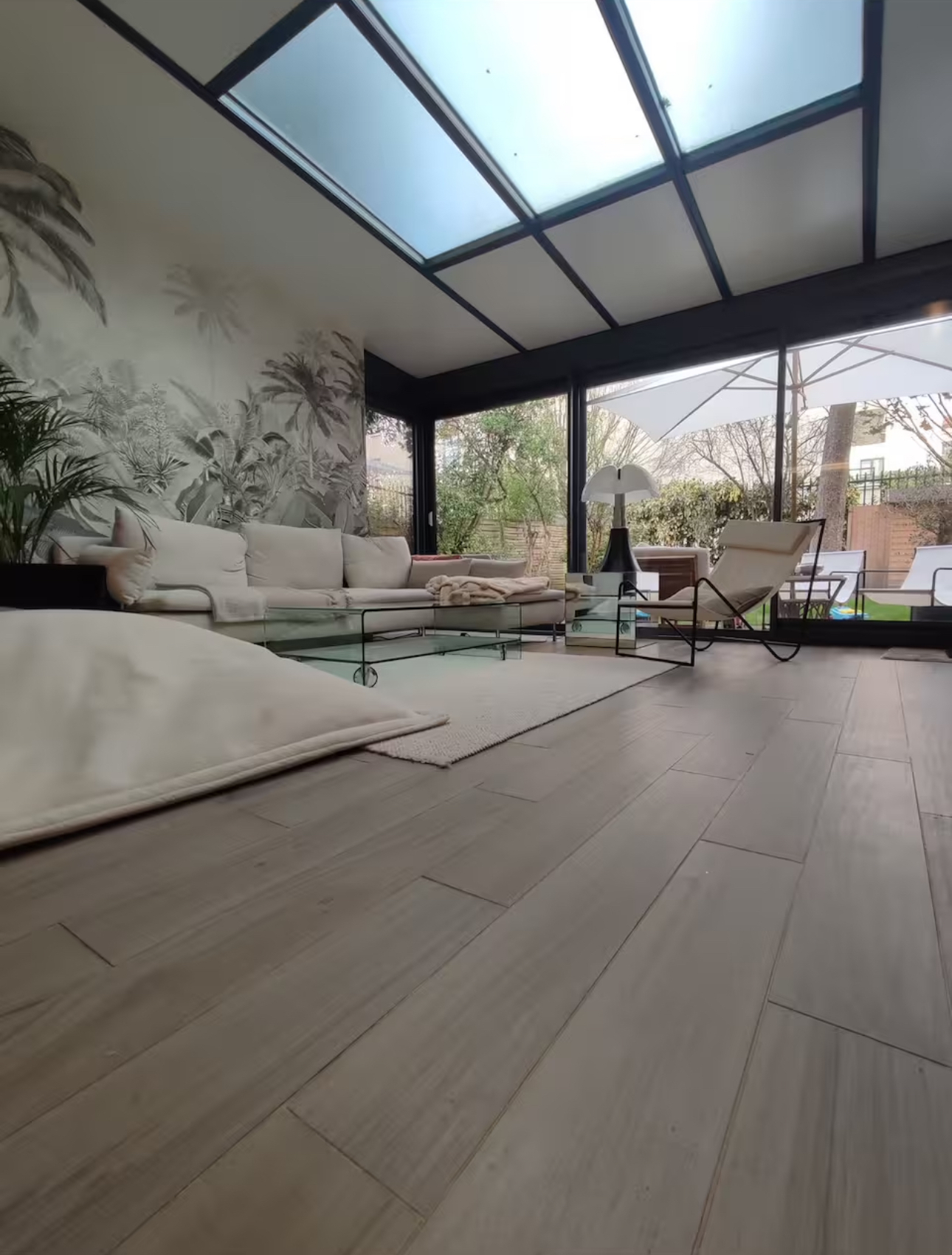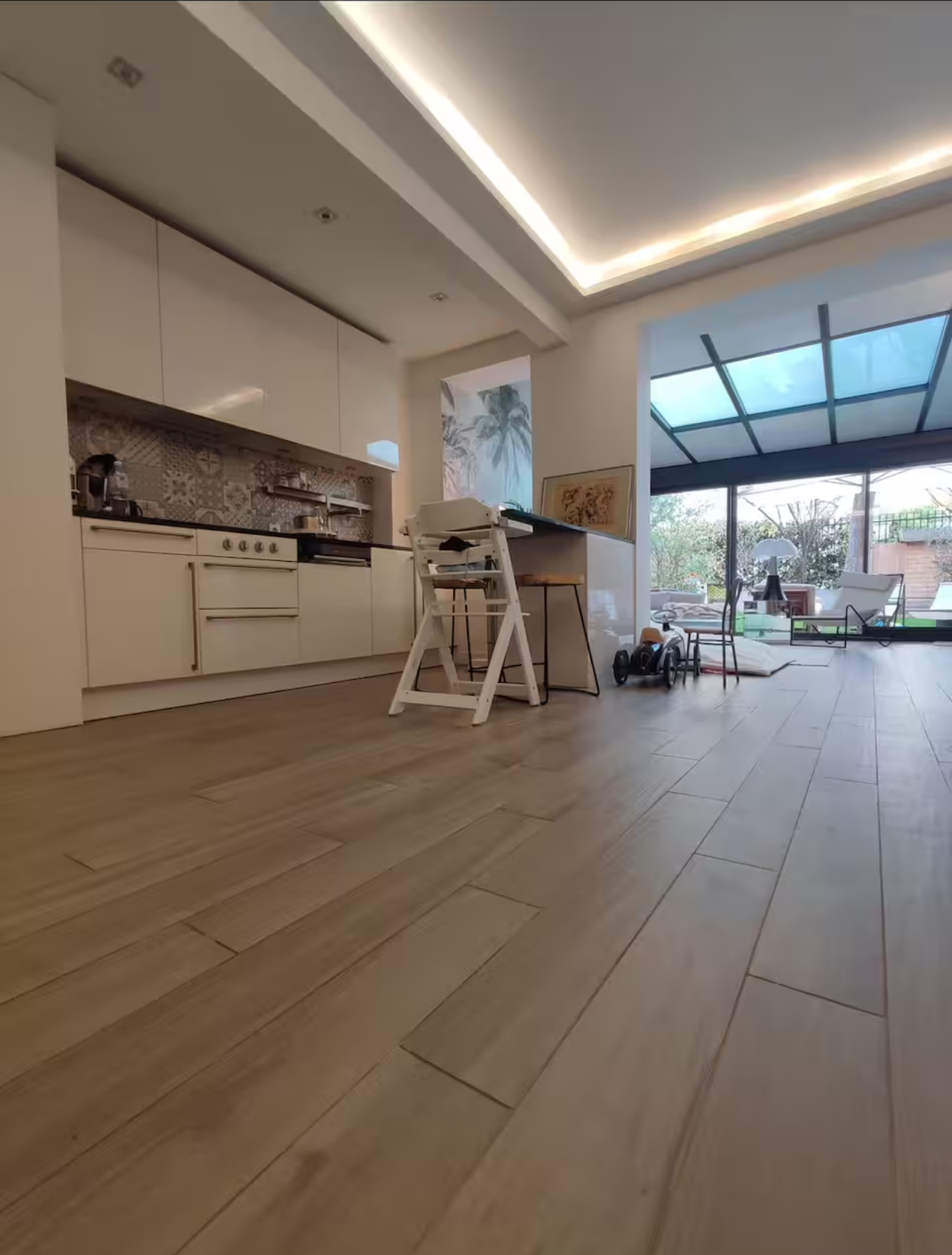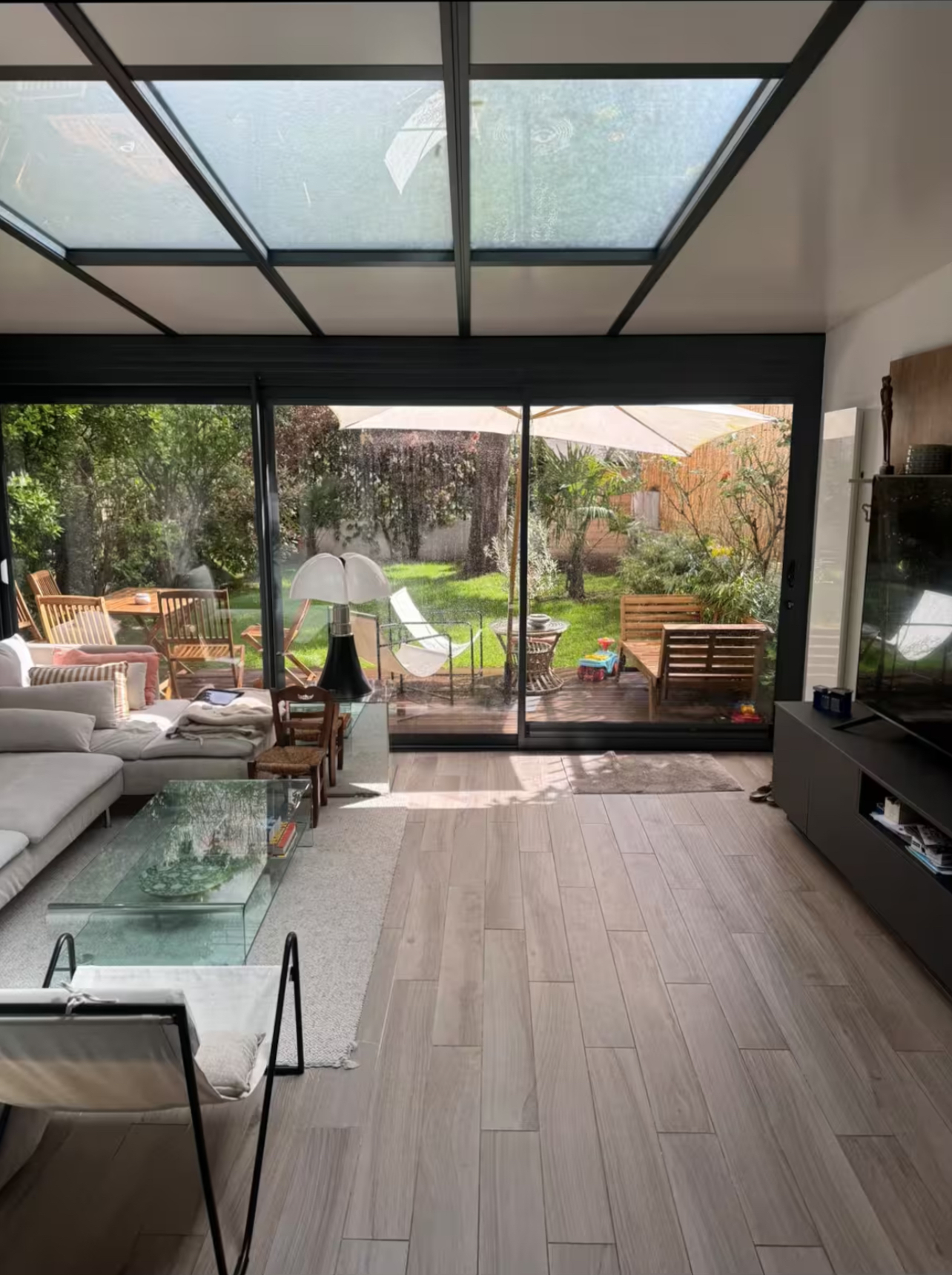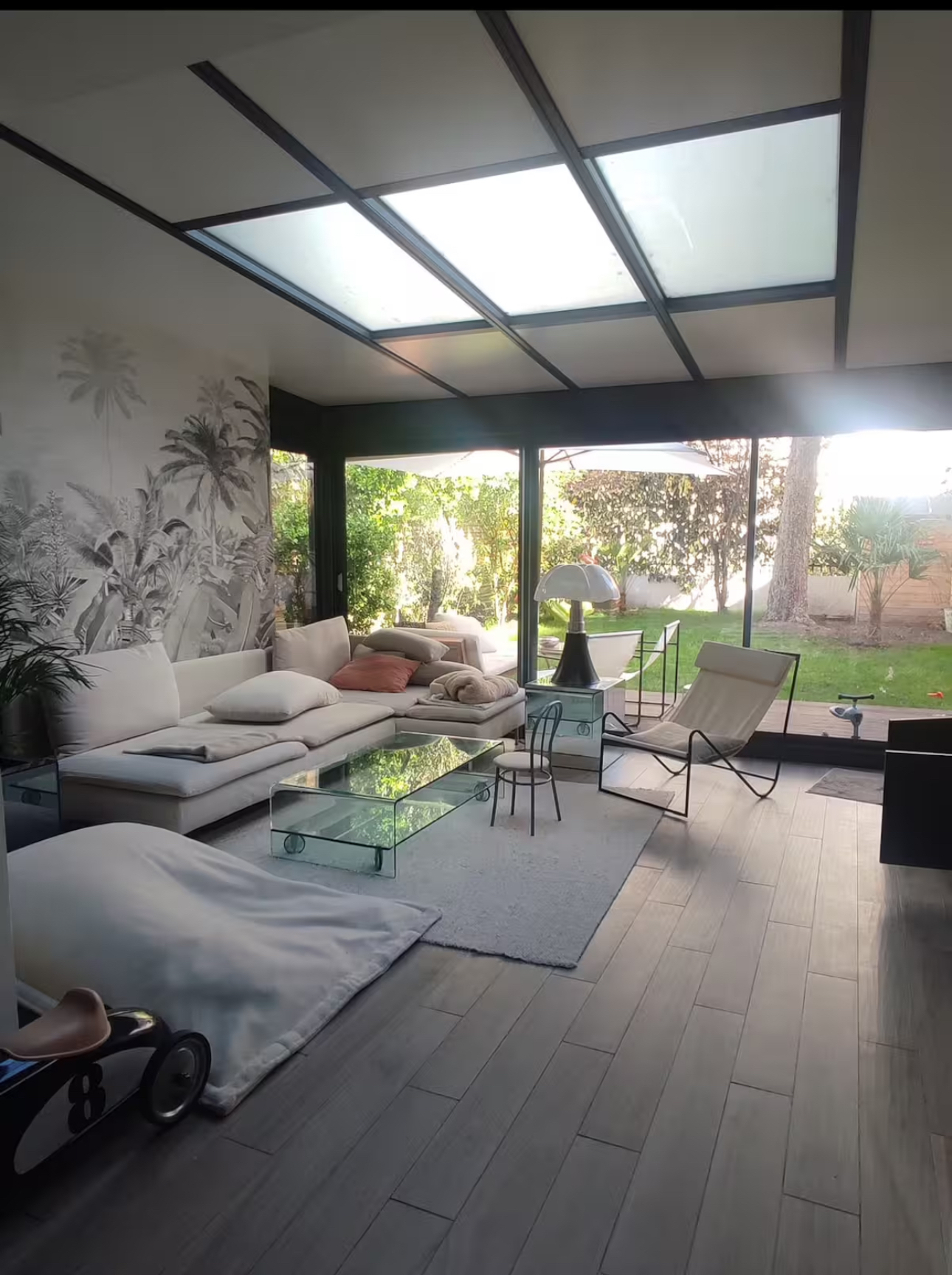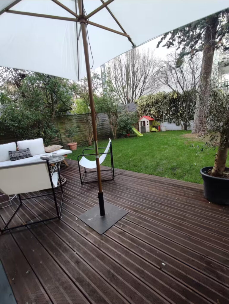Idéal pour une journée détente, télétravail au calme ou moment en famille, l’appartement offre un bel espace de vie avec grandes baies vitrées donnant sur un jardin privatif avec terrasse en bois et plancha.